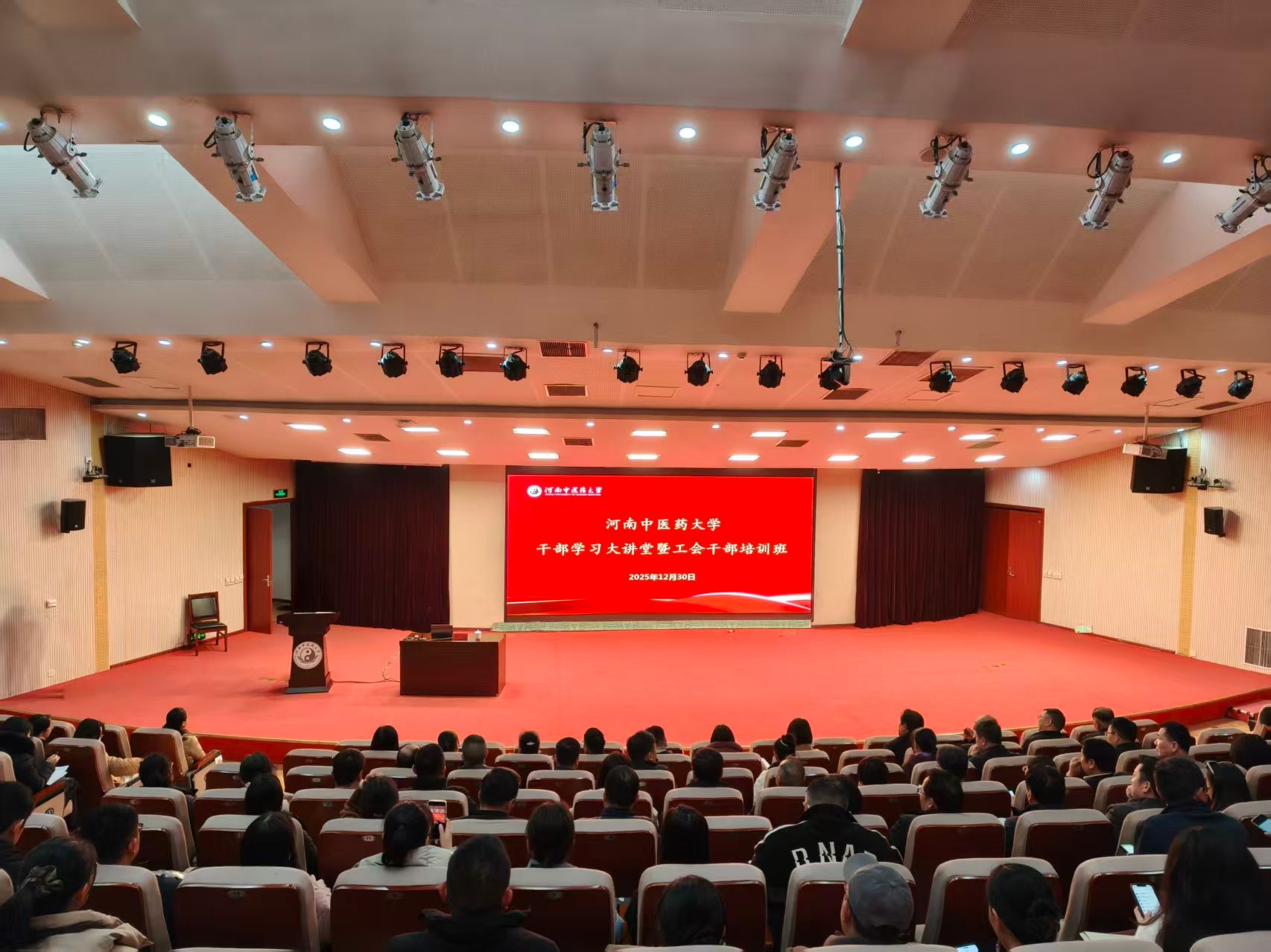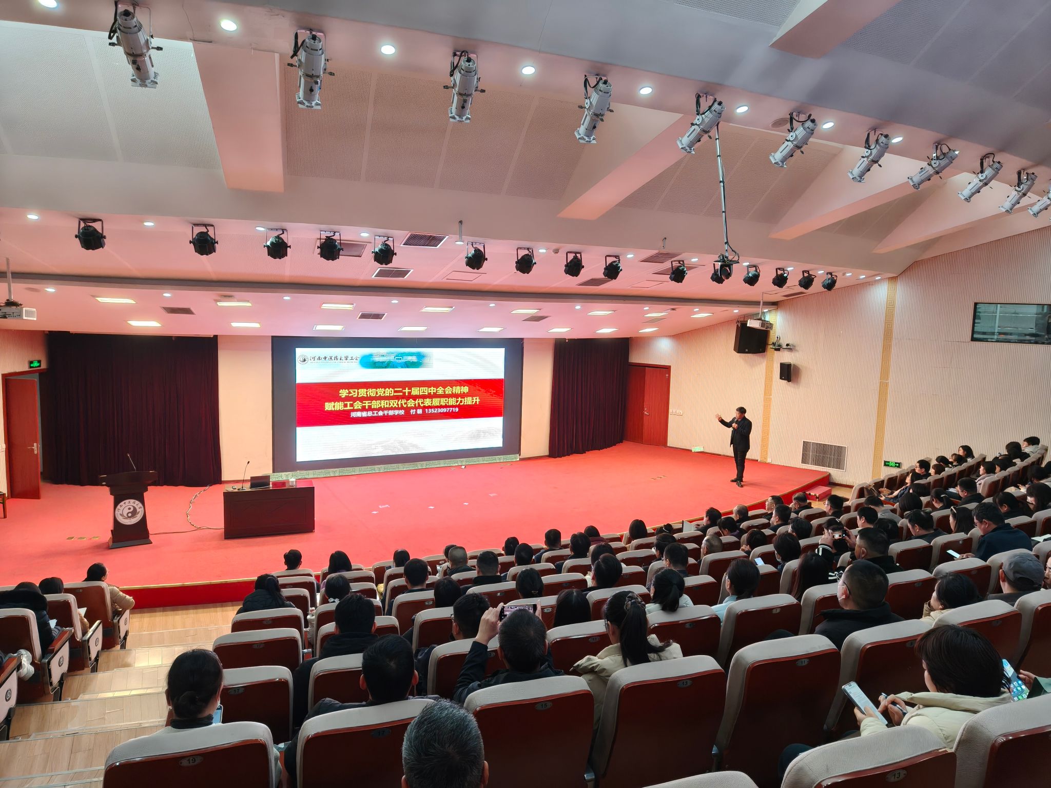 本网讯(文图/荣文慧)为深入学习贯彻党的二十届四中全会精神,全面落实习近平总书记关于工会工作的重要论述,进一步强化工会干部队伍建设,切实提升工会干部和“双代会”代表履职能力,校工会于12月30日下午举办校内干部学习大讲堂暨工会干部培训班。校本部及各附属医院200余名工会专兼职干部和“双代会”代表参加了培训。开班仪式由校工会副主席王浩然主持。