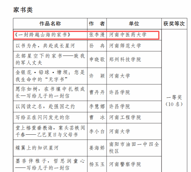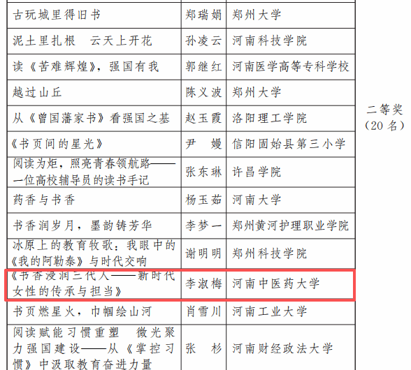 具体获奖情况为:家书类,张李漫《一封跨越山海的家书》获一等奖,赵文静《灯下书》获优秀奖;征文类,李淑梅《书香浸润三代人——新时代女性的传承与担当》获二等奖,李杰《百年光辉心向党 砥砺前行再出发》获三等奖;书画类,张可可《莲》获优秀奖。